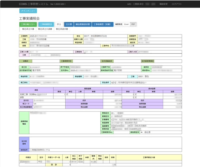 弊社は、生産設備の修繕工事等を行う際、注文書や注文請書、請求書などを発行し協力会社と工事契約を行っていますが、この一連の契約業務を電子化しました。 既存の工事管理システムと電子契約クラウドサービスを連携させることで、注文書の発行から承認、契約完了までが自動で完了します。